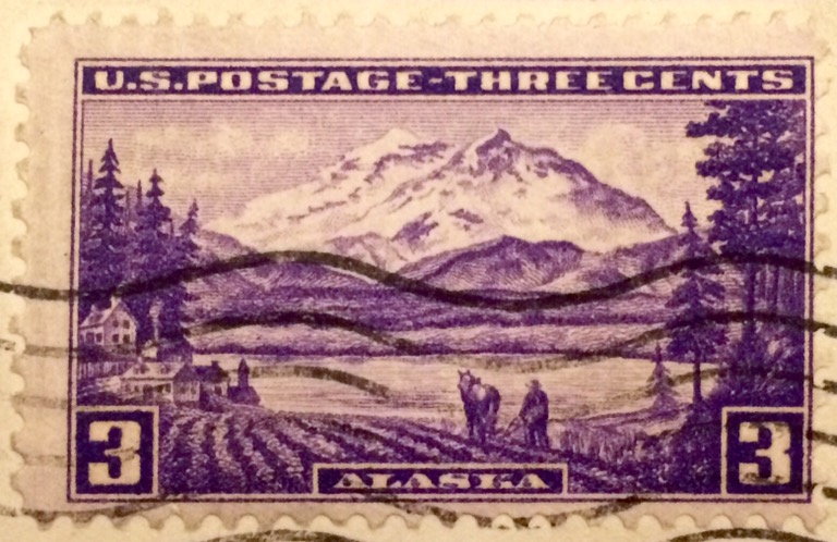More than 20 years before Alaska became a state, the Alaska Territory was the feature of this beautiful violet stamp. In the background is Denali, then officially known as Mt. McKinley. The foreground is an example of a typical Alaskan subsistence farmer. Alaska has a short growing season, but almost 24 hours of daylight for part of the summer. If you go to the Alaska State fair, you will see some massive heads of cabbage.
