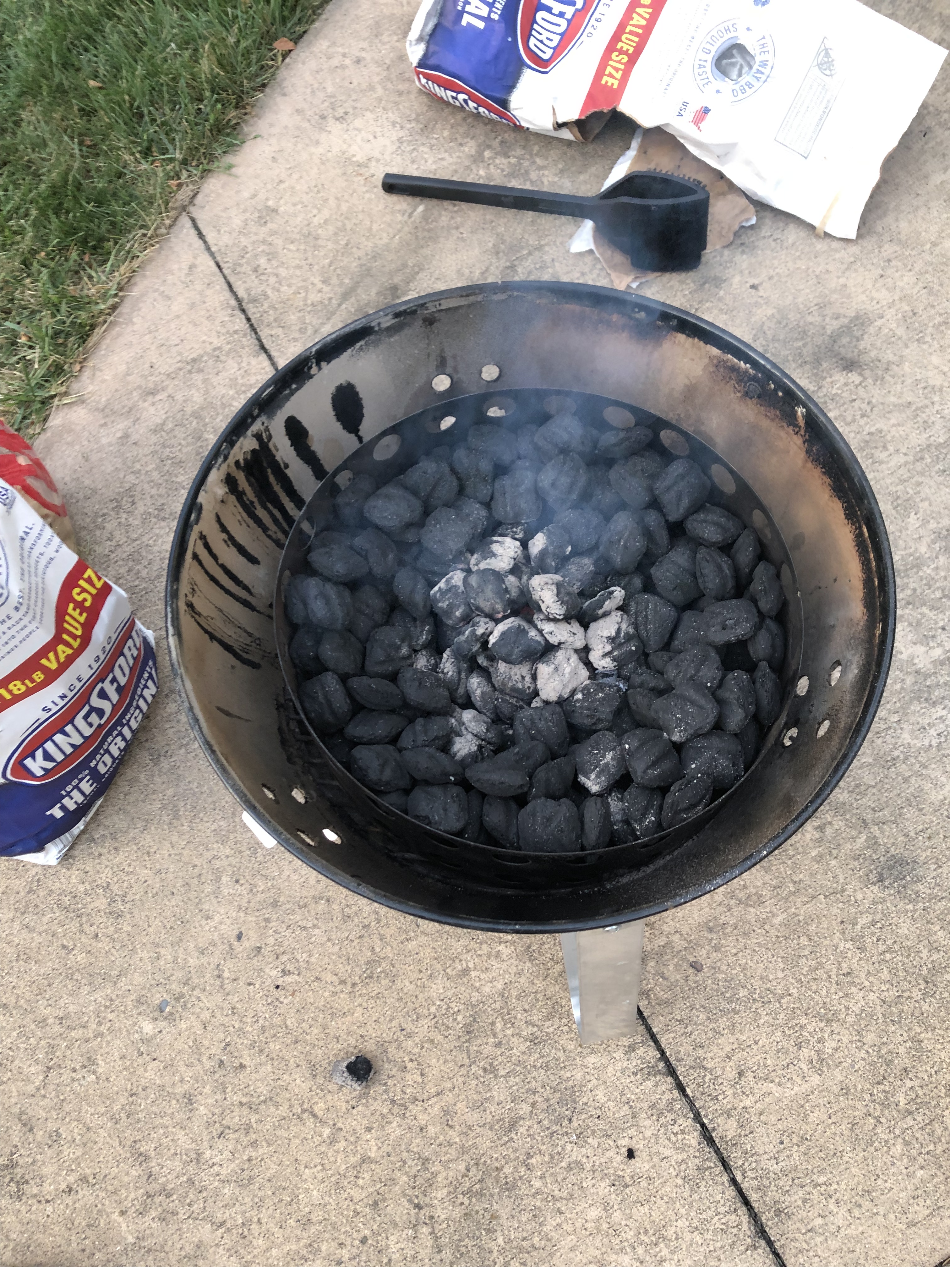 For this smoke, I decided to try the Minion Method, which is supposed to allow the longest amount of time without having to tend to the smoker. Basically you are filling up the charcoal ring to the max, and placing a small number of hot coals in an opening in the middle of the ring.