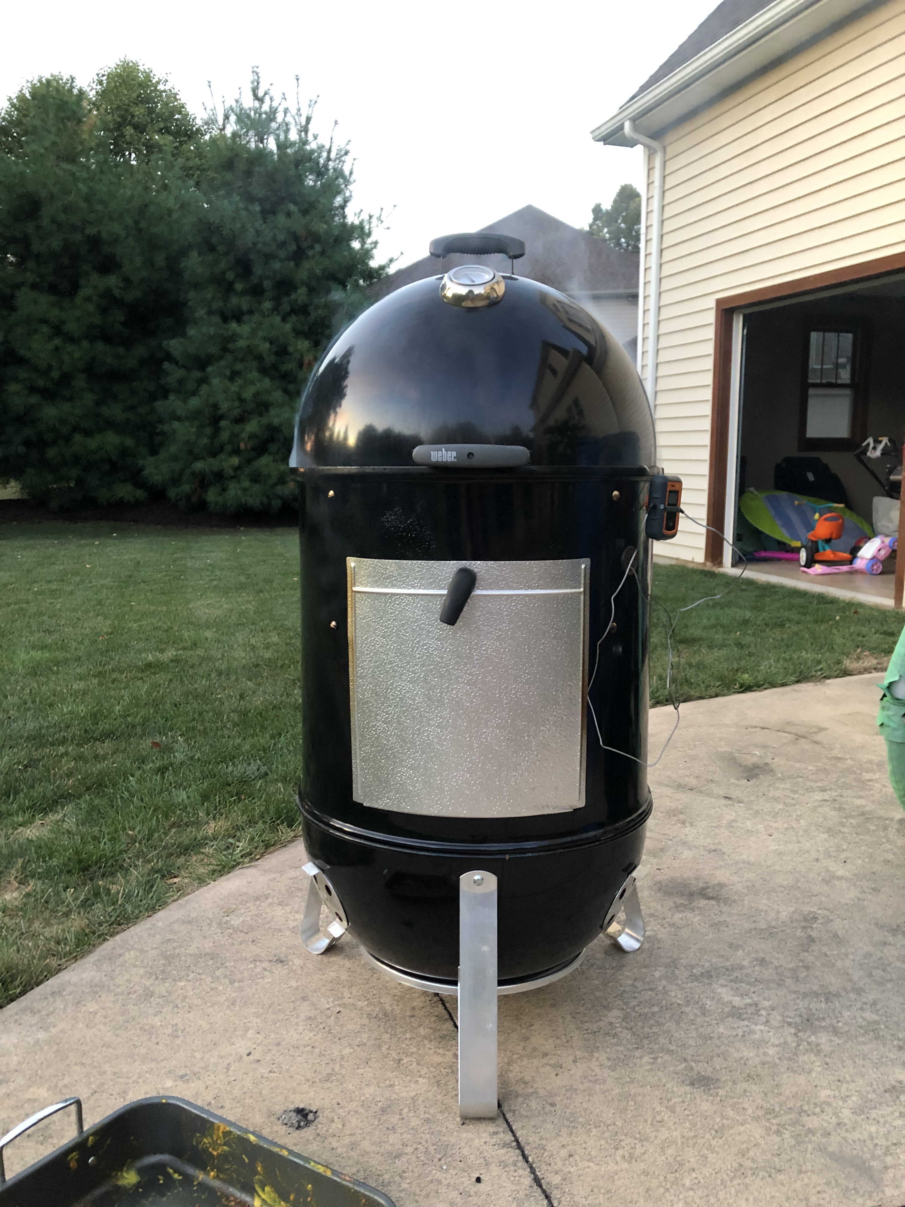 I checked the grill and 90% of the charcoal was expended. I poured in as many coals a I could fit in the ring and added another 25 lit coals to the top. I also refilled the water pan, which was almost empty. I added four more pieces of cherry wood and opened the dampers. When the temperature got back up to 200, I put the dampers at 1/4. The temperature got back in the 270s, so I closed all the dampers so they were just barely open and went back to sleep.