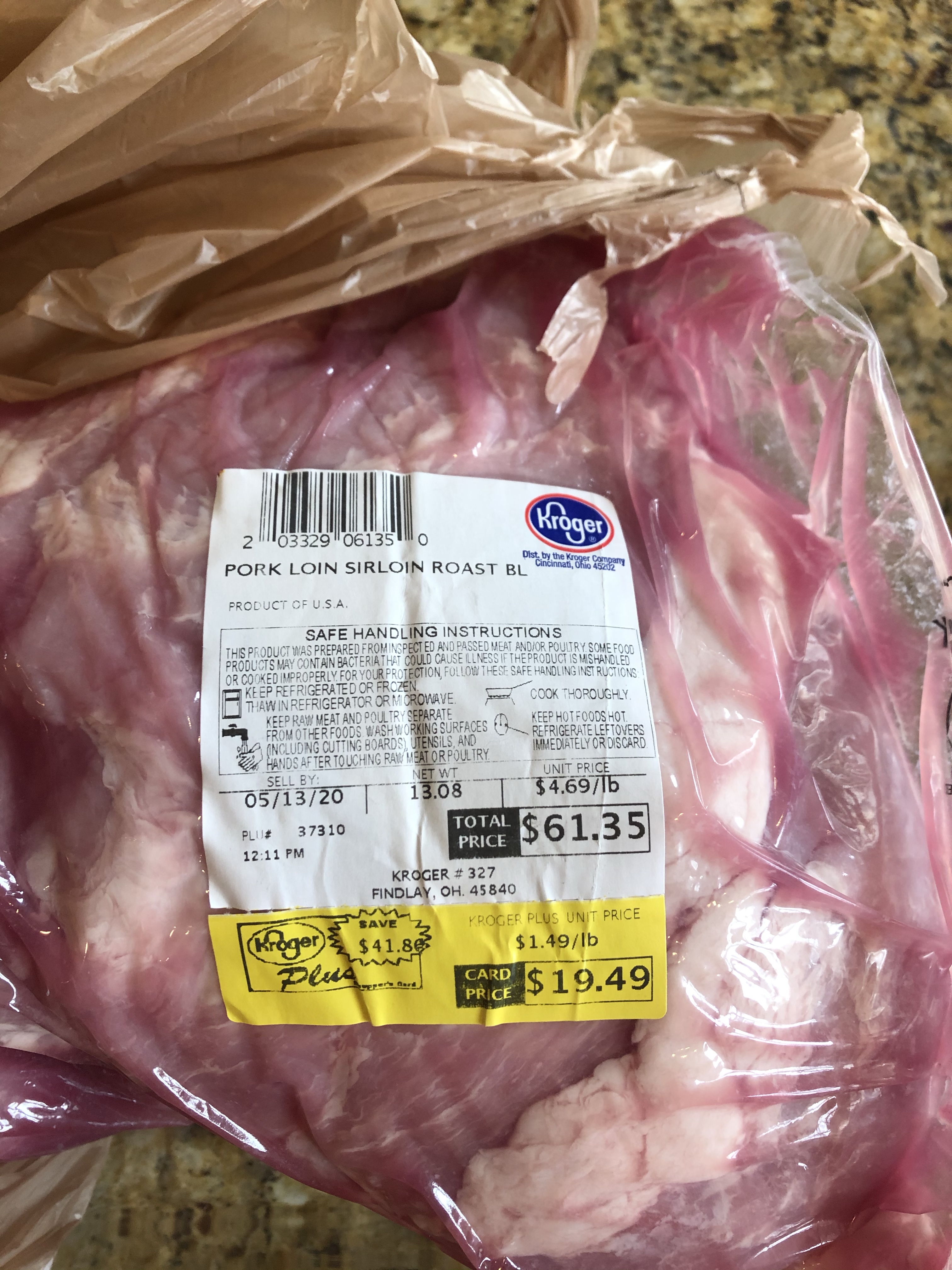 In this time of meat shortages, my wife still manages to find some impressive values. This was the case when she came home with a 13 pound boneless pork sirloin roast for $19.49 from Kroger.
