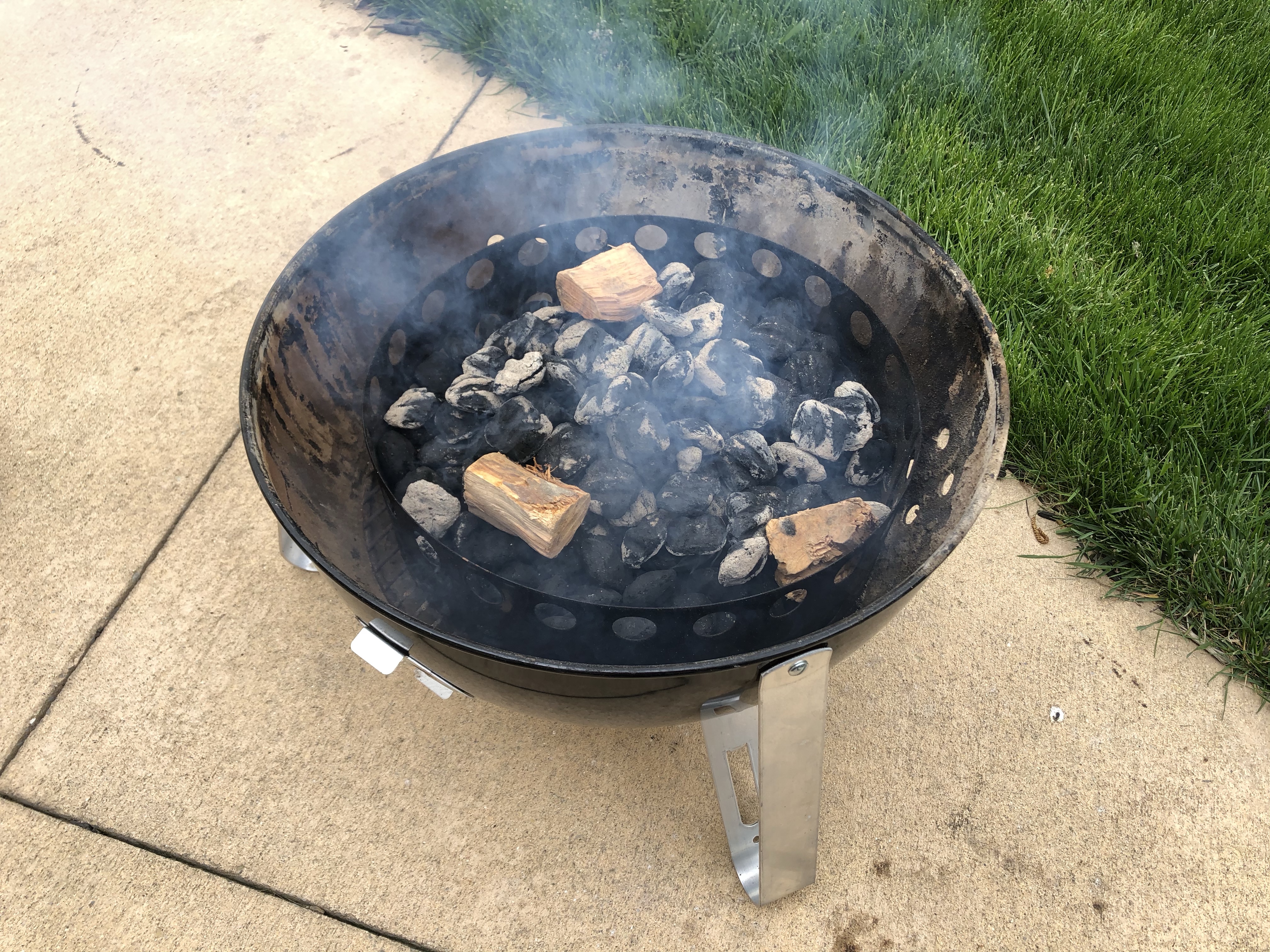 My goal was to smoke the roasts hot to a temperature of 145 F for sliceable pork, as opposed to the low and slow smoke that I use to get pork shoulders over 200 F. I used three chunks of apple wood and evenly distributed the hot coals for maximum heat.